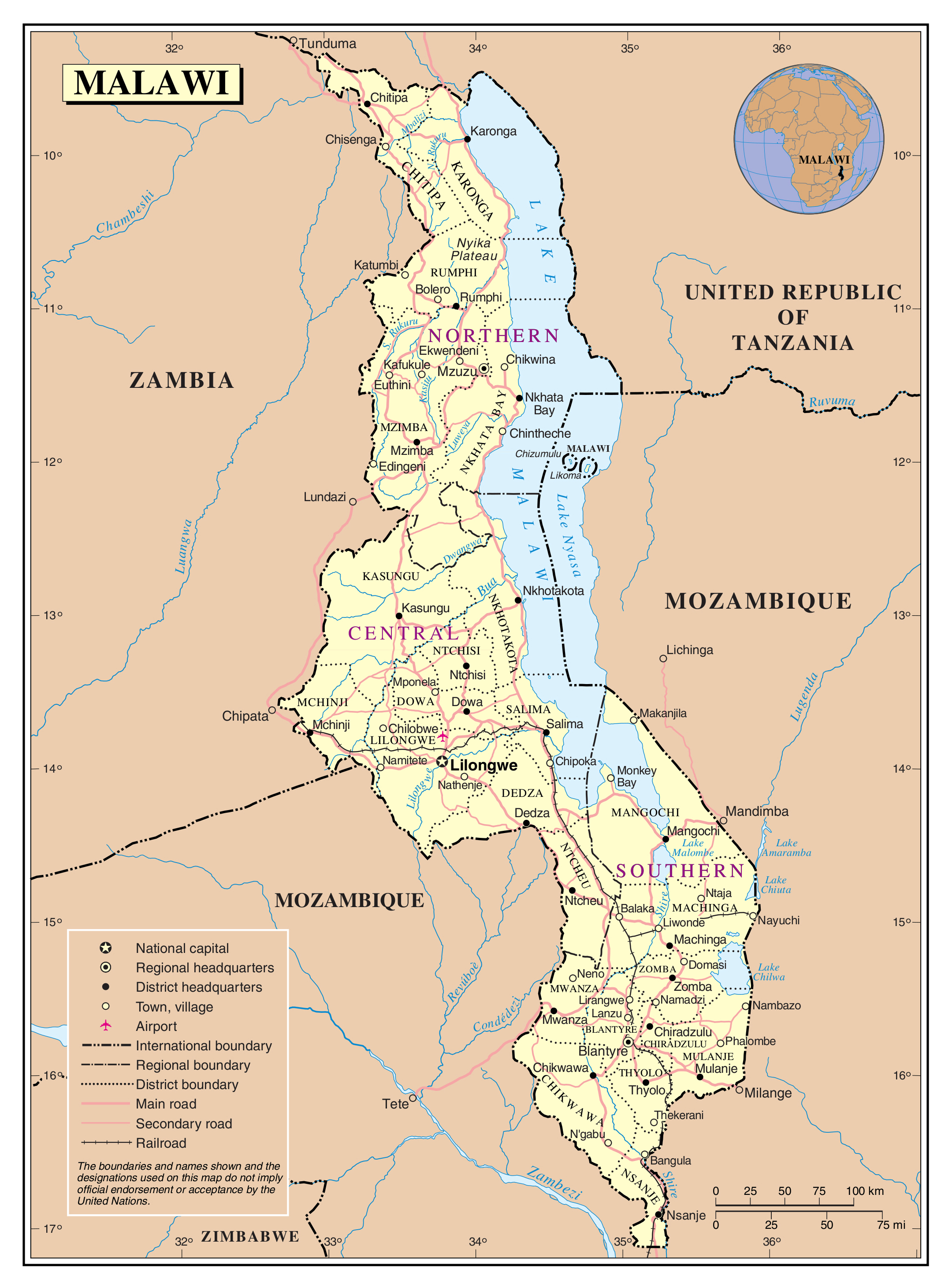 Malawi large detailed political and administrative map with roads, railroads, cities and airports. Large detailed political and administrative map of Malawi with roads, railroads, cities and airports.
