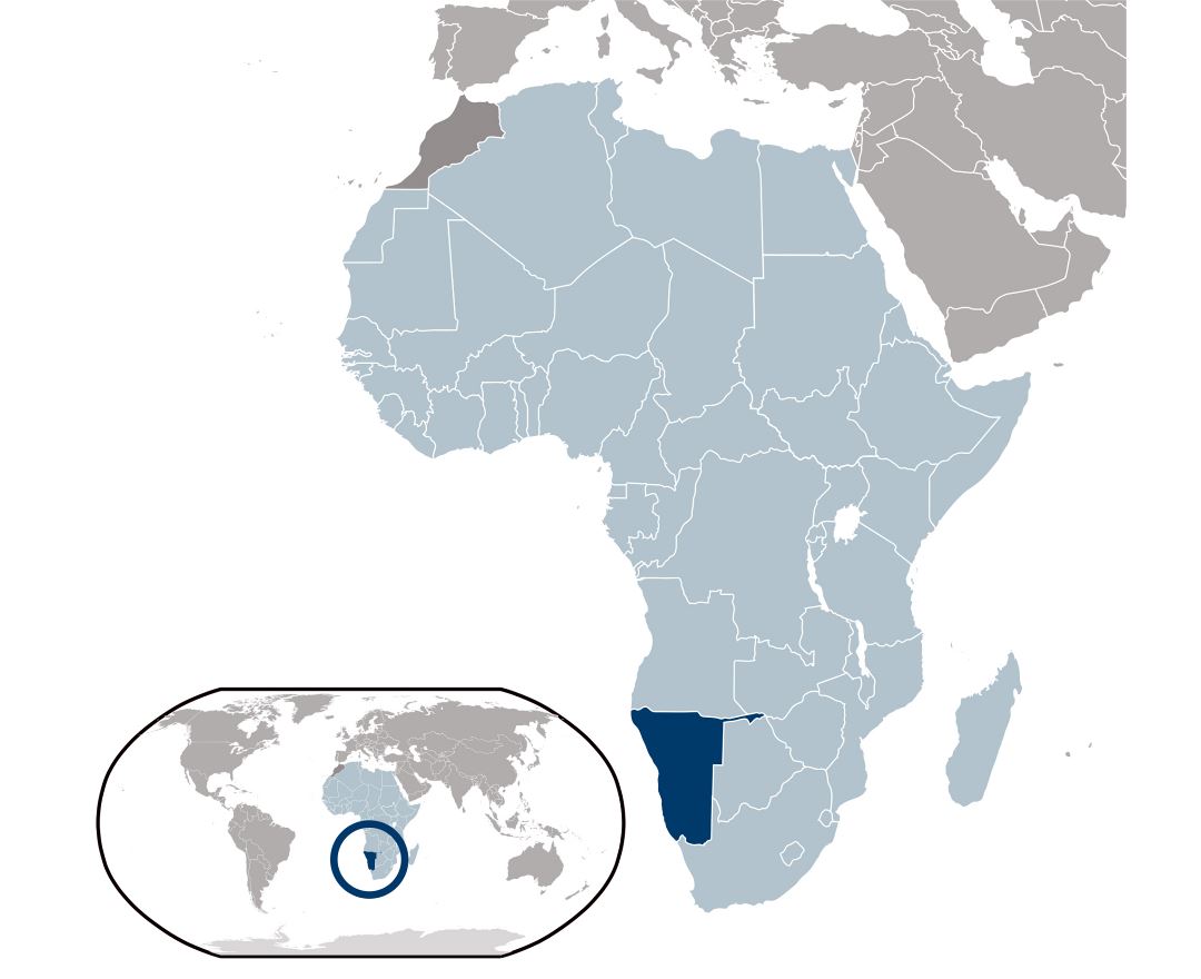 Namibia officially the Republic of Namibia, is a country in southern Africa whose western border is the Atlantic Ocean. It shares land borders with Zambia and Angola to the north, Botswana to the east and South Africa to the south and east. Although it does not border Zimbabwe, a part of less than 200 metres of the Zambezi River (essentially a small bulge in Botswana to achieve a Botswana/Zambia micro-border) separates the two countries. Namibia gained independence from South Africa on 21 March 1990, following the Namibian War of Independence. Its capital and largest city is Windhoek, and it is a member state of the United Nations (UN), the Southern African Development Community (SADC), the African Union (AU), and the Commonwealth of Nations.