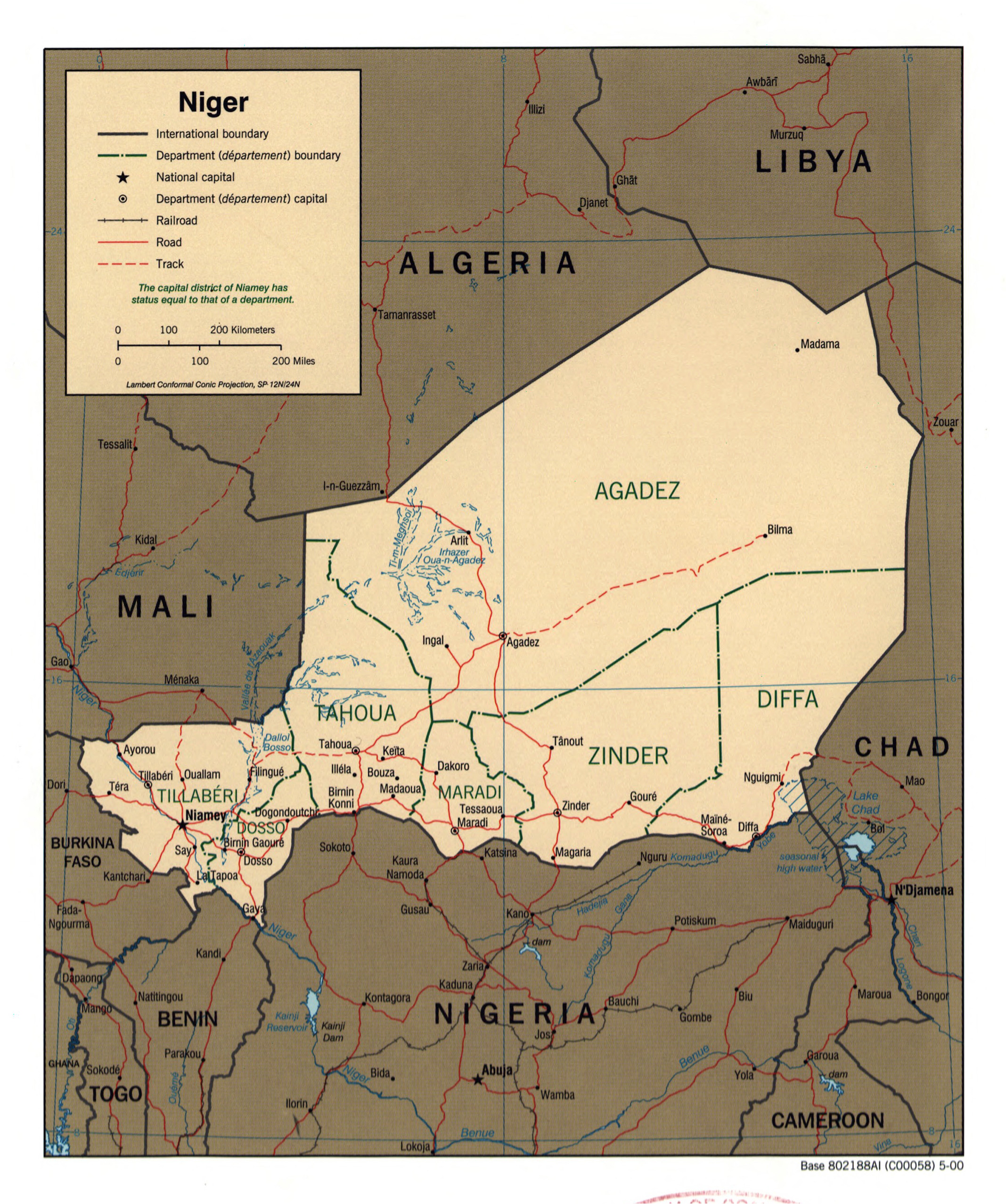 Large political and administrative map of Niger with roads, railroads and major cities - 2000