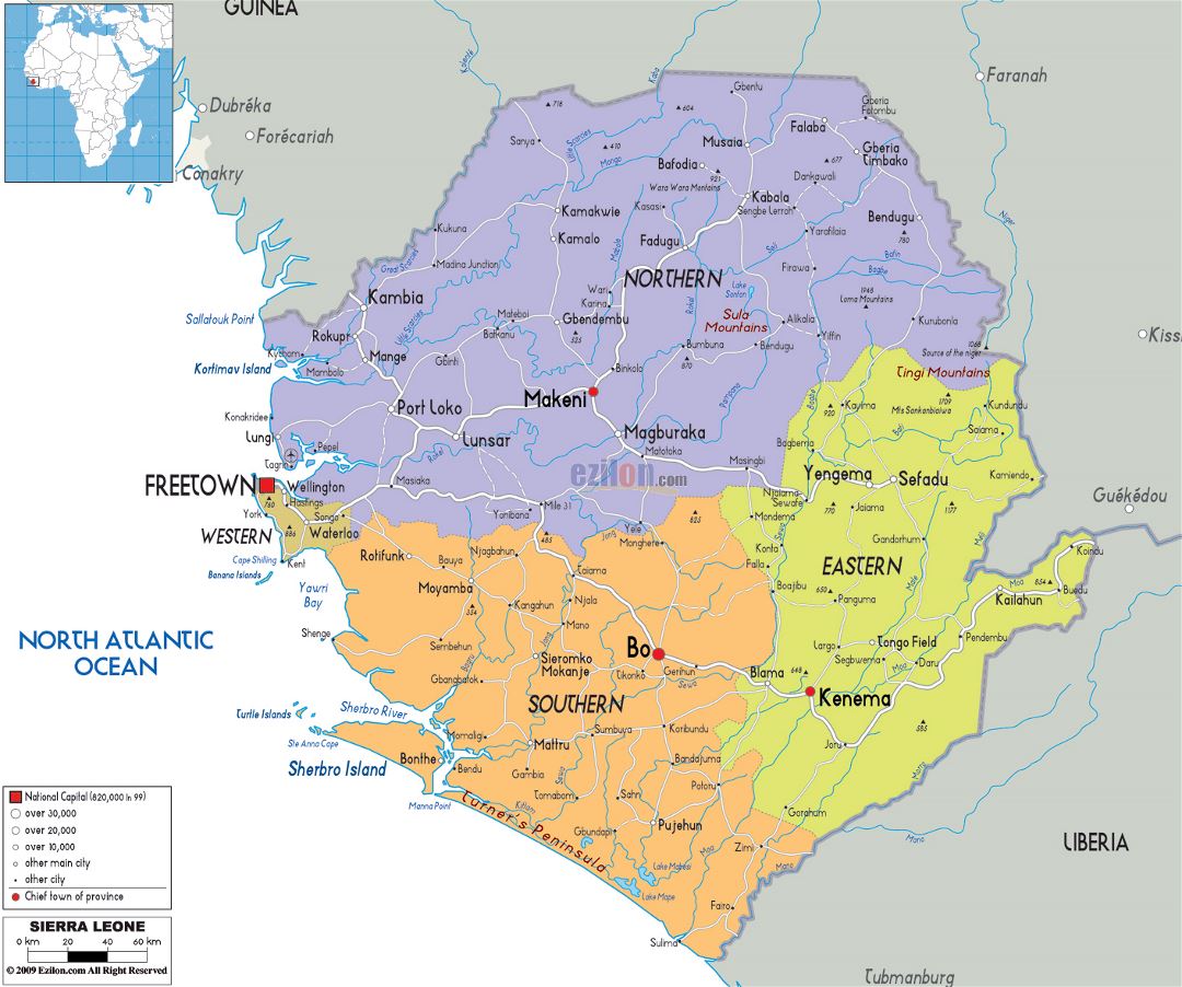 Sierra Leone large political and administrative map with roads, cities and airports. Large political and administrative map of Sierra Leone with roads, cities and airports.