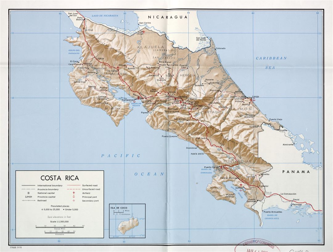 Costa Rica large detailed political and administrative map with relief, roads, railroads, major cities, ports and airports - 1970. Large detailed political and administrative map of Costa Rica with relief, roads, railroads, major cities, ports and airports - 1970.