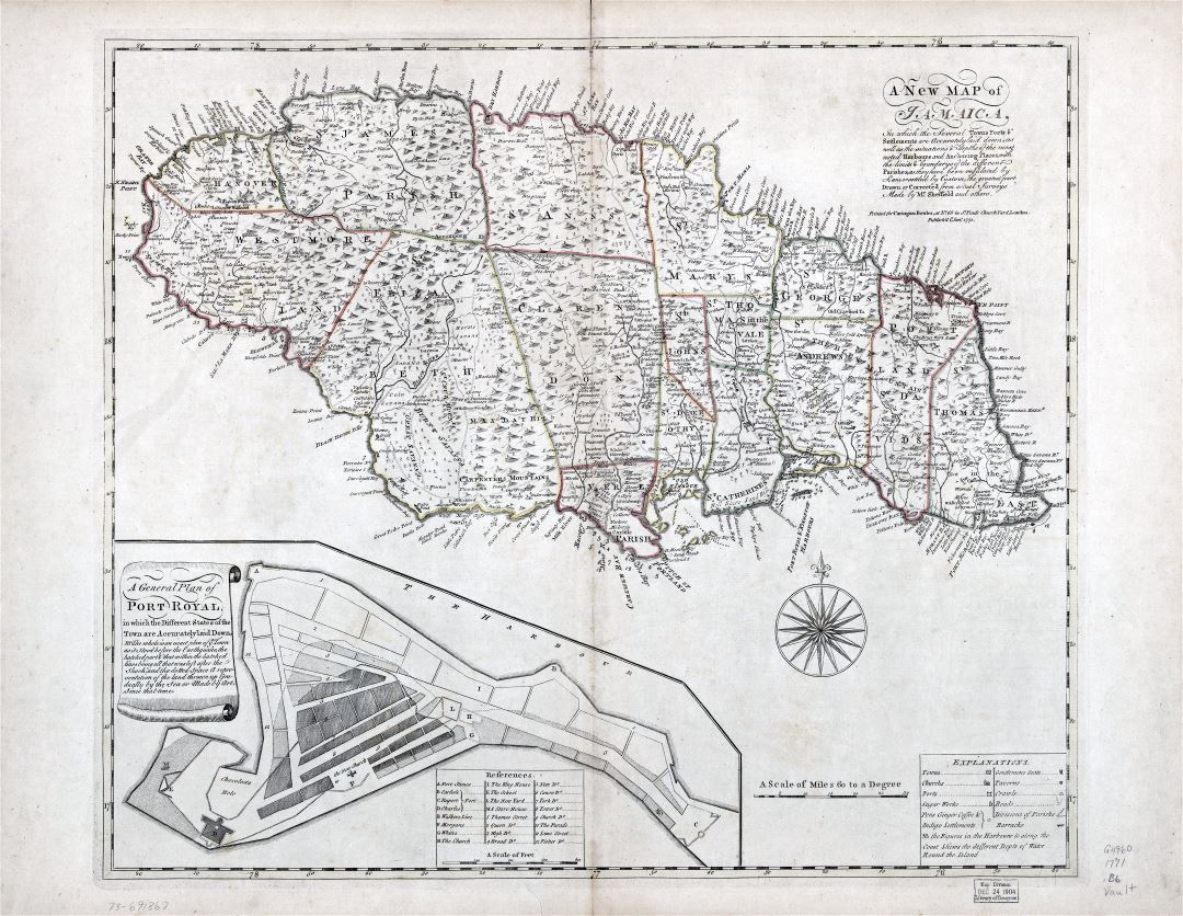 Jamaica large scale detailed old map with relief, administrative divisions and other marks - 1771. Large scale detailed old map of Jamaica with relief, administrative divisions and other marks - 1771.