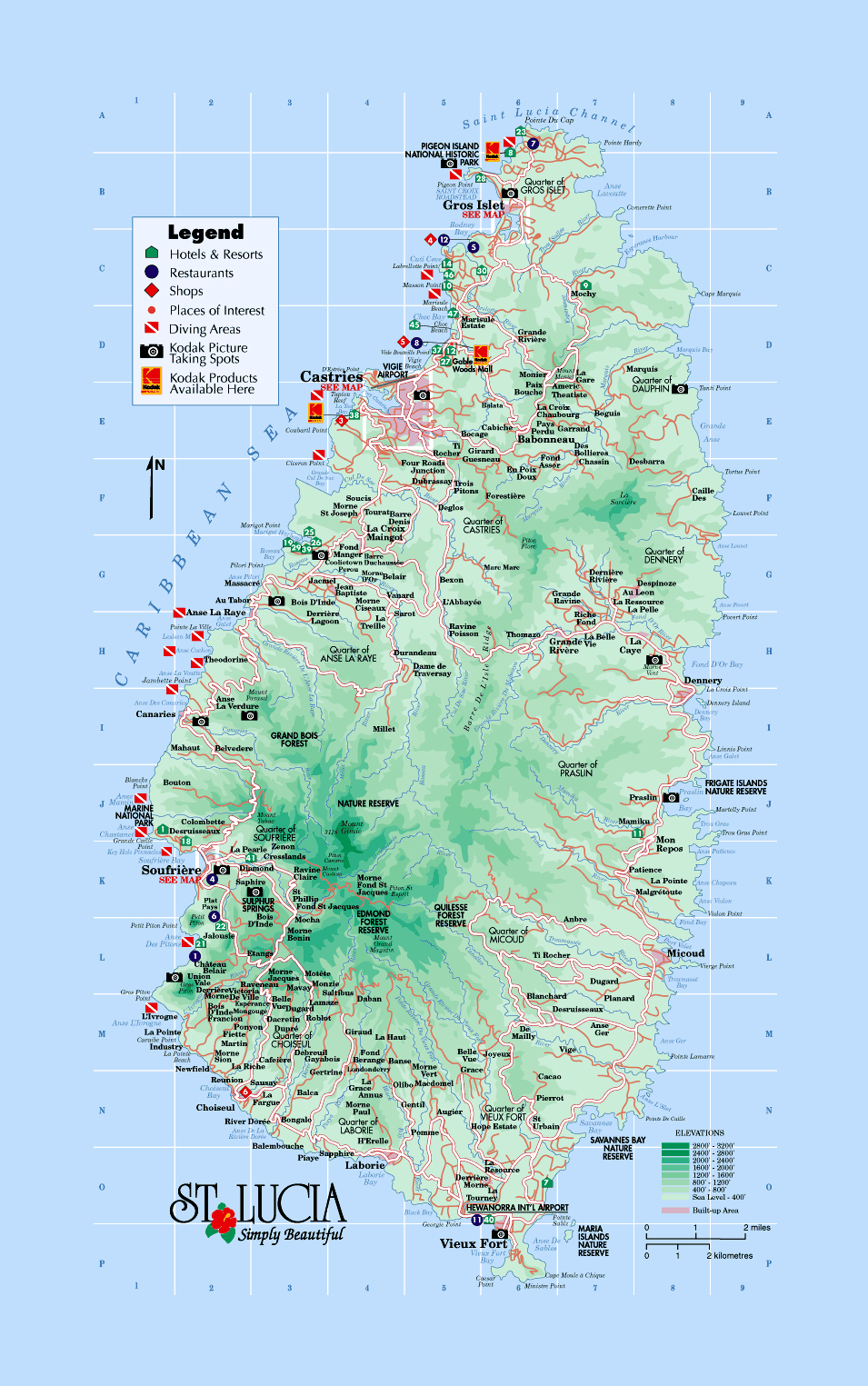 Detailed tourist and elevation map of Saint Lucia with roads, cities and other marks