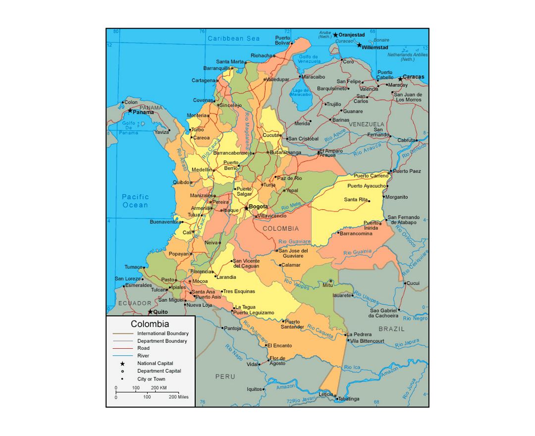 Colombia, officially the Republic of Colombia, is a transcontinental country largely situated in the northwest of South America, with territories in North America. Colombia is bordered to the northwest by Panama, to the east by Venezuela and Brazil, to the south by Ecuador and Peru, and it shares maritime limits with Costa Rica, Nicaragua, Honduras, Jamaica, the Dominican Republic, and Haiti. It is a unitary, constitutional republic comprising thirty-two departments.