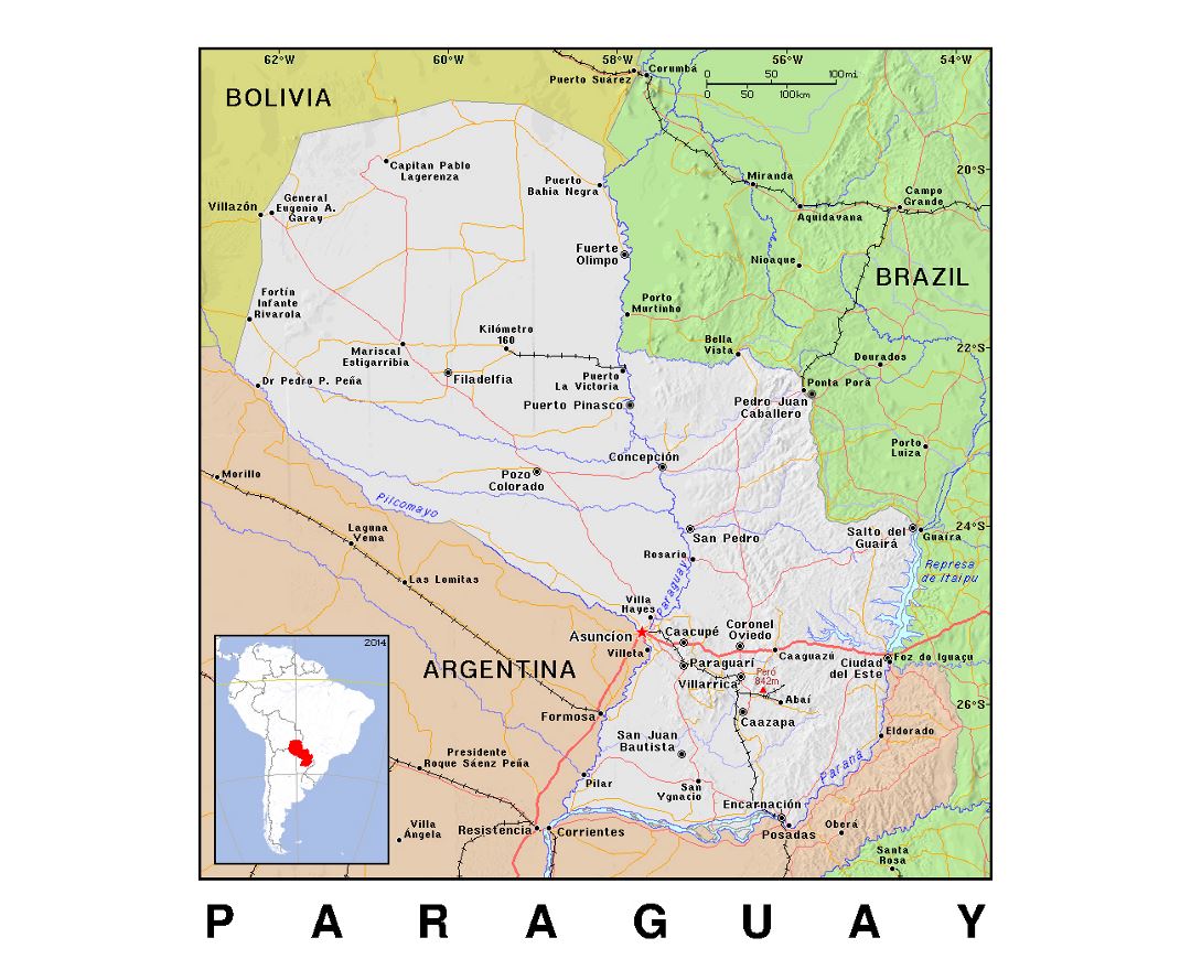Paraguay, officially the Republic of Paraguay, is a landlocked country in central South America, bordered by Argentina to the south and southwest, Brazil to the east and northeast, and Bolivia to the northwest. Paraguay lies on both banks of the Paraguay River, which runs through the center of the country from north to south. Due to its central location in South America, it is sometimes referred to as Corazon de Sudamerica "Heart of South America".