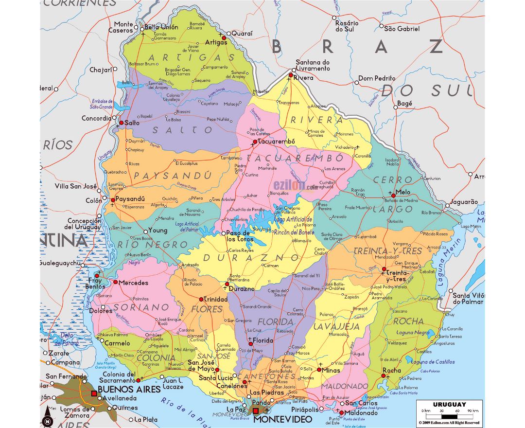 Uruguay, officially the Oriental Republic of Uruguay, is a country in the southeastern region of South America. It is bordered by Argentina to its west and Brazil to its north and east, with the "Río de la Plata" (River of Silver) to the south and with the Atlantic Ocean to the southeast. Uruguay is home to 3.3 million people, of whom 1.8 million live in the metropolitan area of its capital and largest city, Montevideo. With an area of approximately 176,000 square kilometres (68,000 sq mi), Uruguay is geographically the second-smallest nation in South America after Suriname.